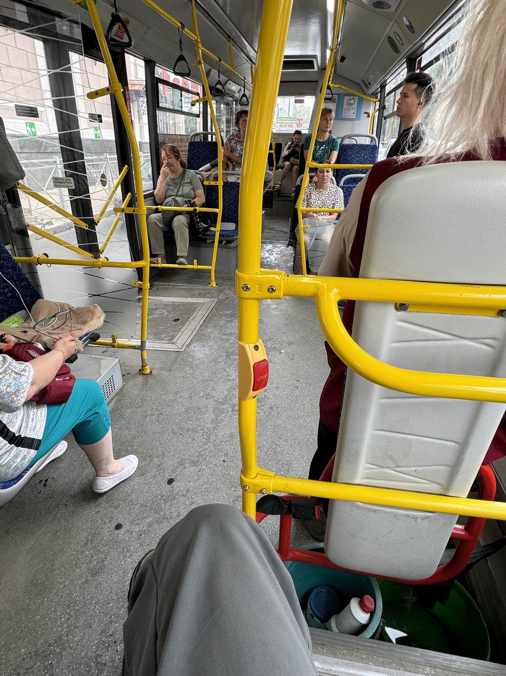 睡眠不足, 虽然累但醒了好几次, 睡觉质量不太行了, 感觉外面下了大雨. 9:45起来, 早餐是2个面包+菠萝汁. 10:10分出门, 发现确实下了大雨, 空气清爽. 坐54路公交车, 42卢布, 车上有售票员. 这是我第一次坐俄罗斯的公交车, 用Yandex.map查的线路, 可以看到线路上所有公交车的实时位置和移动, 很方便!
