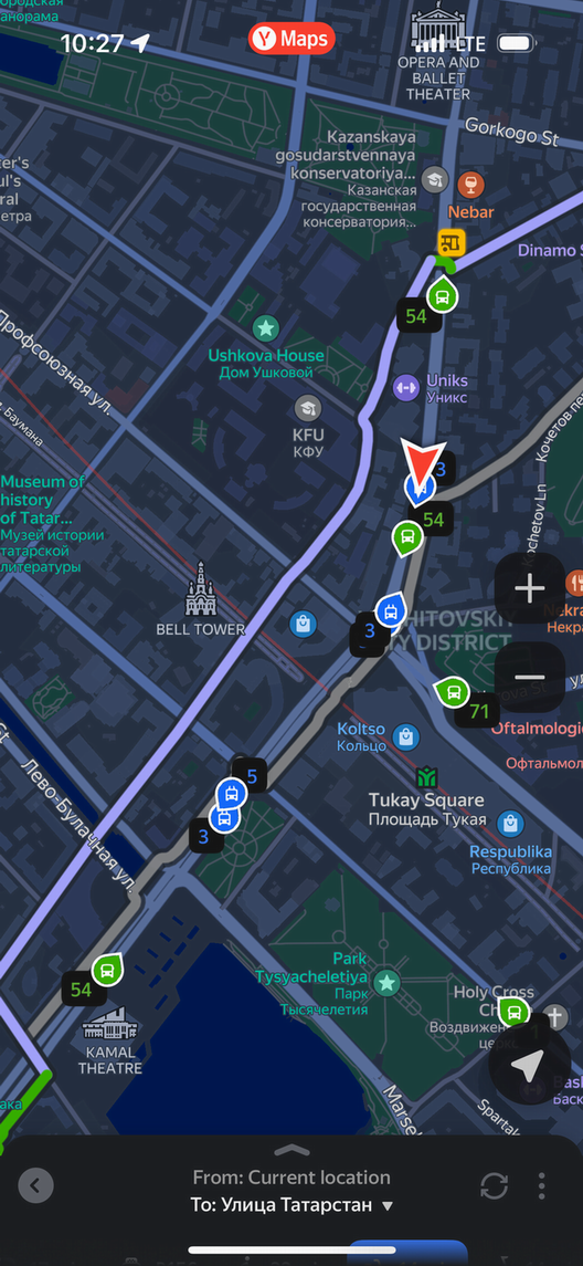 用Yandex.map查的线路, 可以看到线路上所有公交车的实时位置和移动, 很方便: