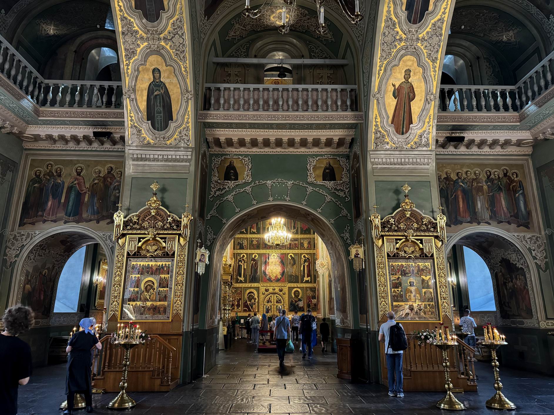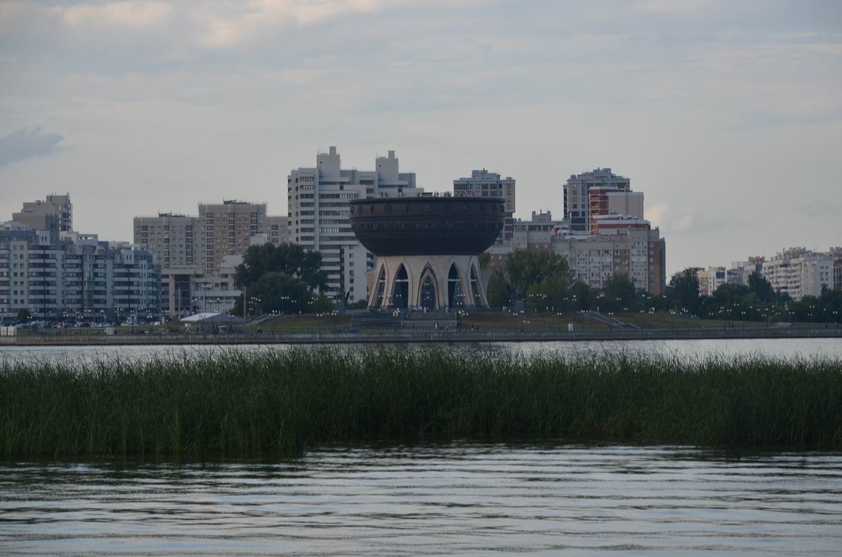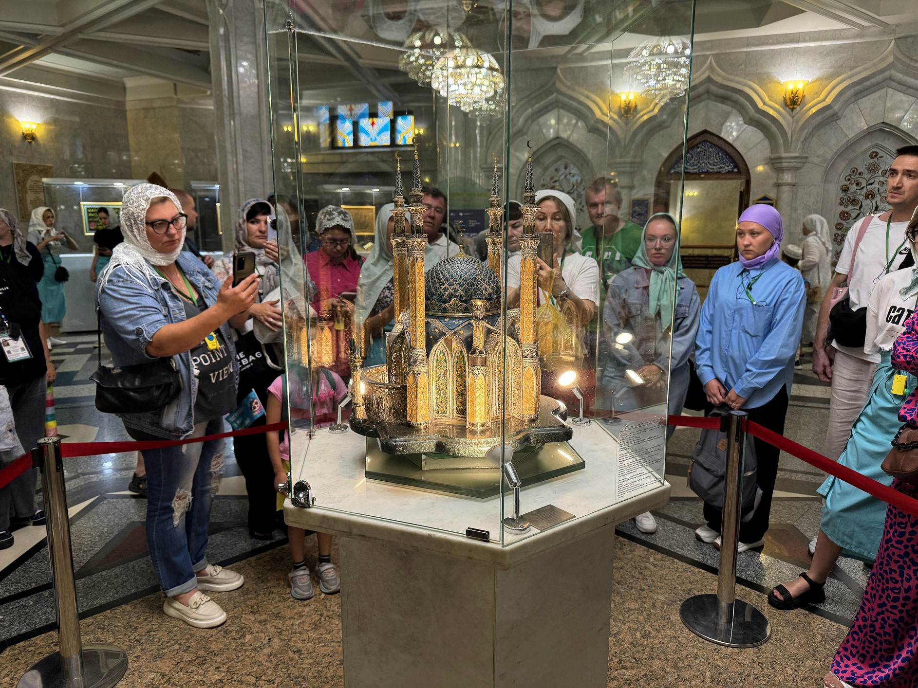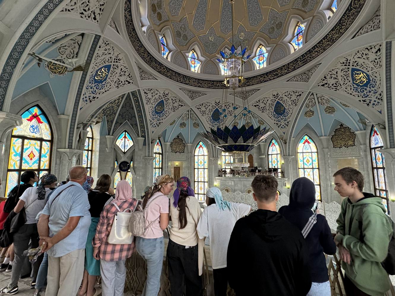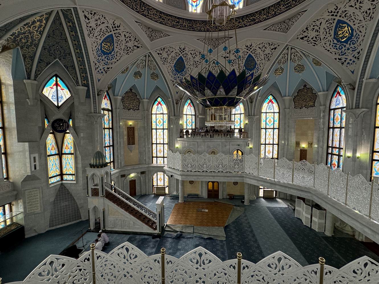 15:30, 来到农业宫前吃午饭, 1个面包+2根香蕉, 顺便晒脚. 又去河边看爱情碗(爱情锅), 买了巧克力和牛奶球冰淇淋200卢布, 卖的人发现是我非常高兴, 可能最近来这边的中国人不多, 这2天我在喀山没遇到中国人. 爱情碗没时间过去了. 16:30, 第2次进克里姆林宫, 很快去教堂内看一眼. 不到17点来到Kul-Sharif清真寺, 一进门有个清真寺的微缩模型, 很多人围着拍. 休息了一会, 排队上楼, 楼上阳台的容纳空间有限, 所以要限流. 看到几个人在做祷告.
