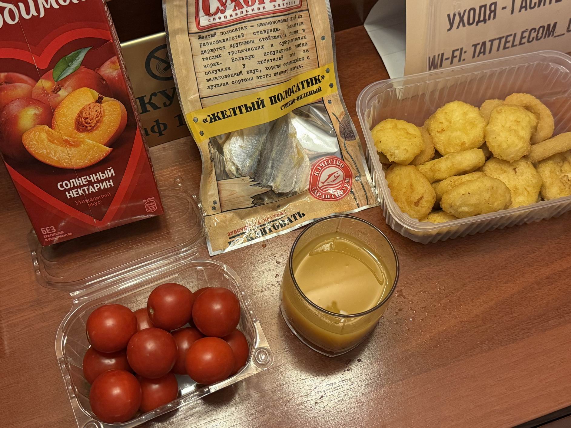 21:15, 坐地铁(42卢布)从Kremlyovskaya站一站路去Tukay Square站, 这个地铁站有很多有意思的马赛克壁画, 克里姆林宫这一站好像也有, 但我因为赶车没注意. Eurospar买了鸡块洋葱圈桃汁巧克力华夫饼水西红柿咸鱼片, 718卢布. 22点多回酒店, 晚饭吃的鸡块咸鱼洋葱圈西红柿桃汁.
