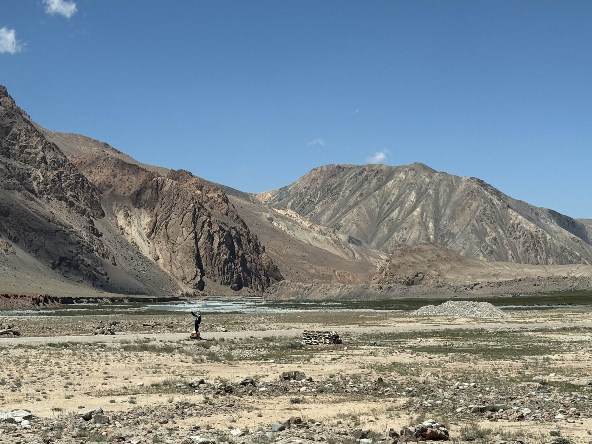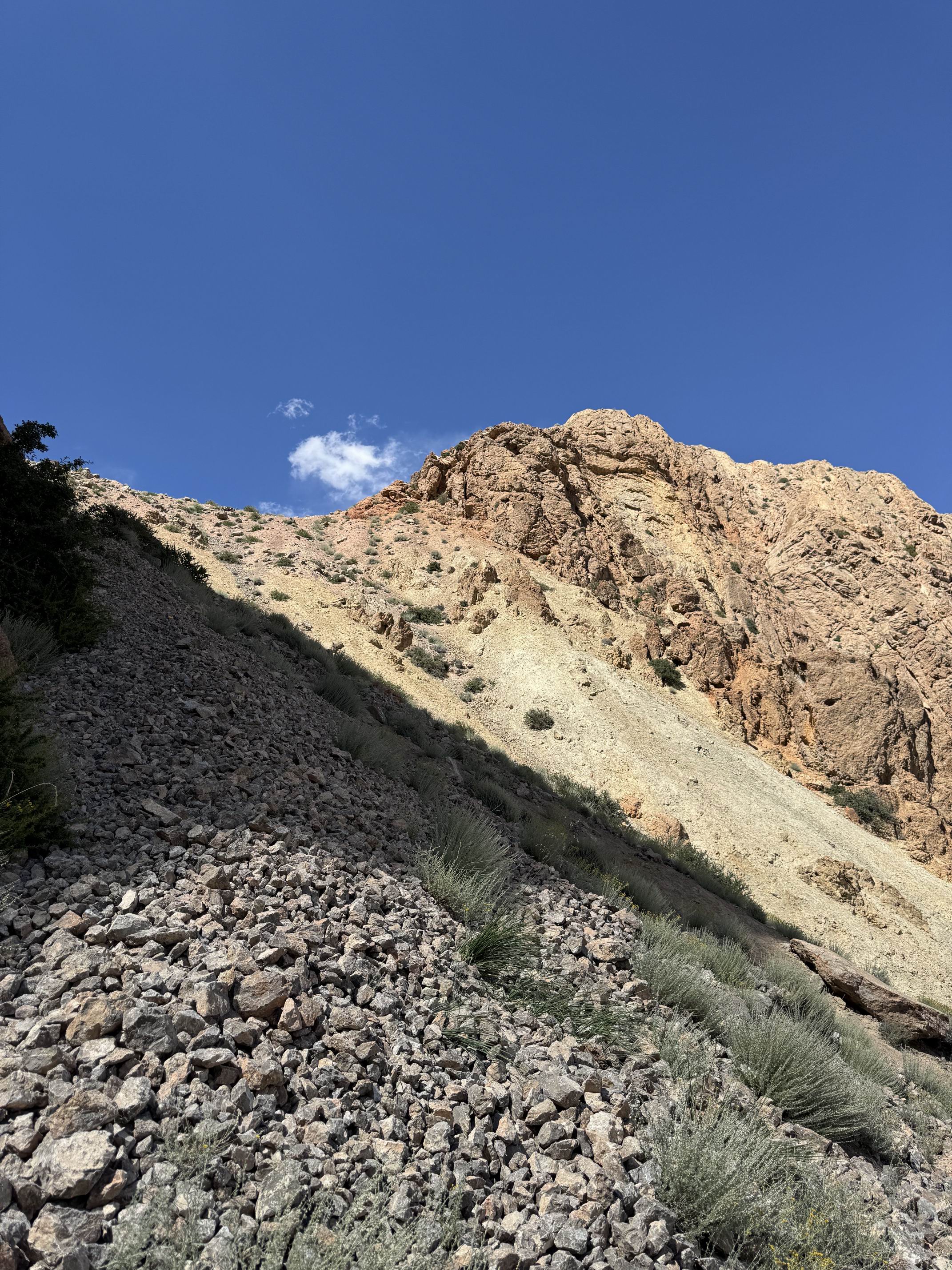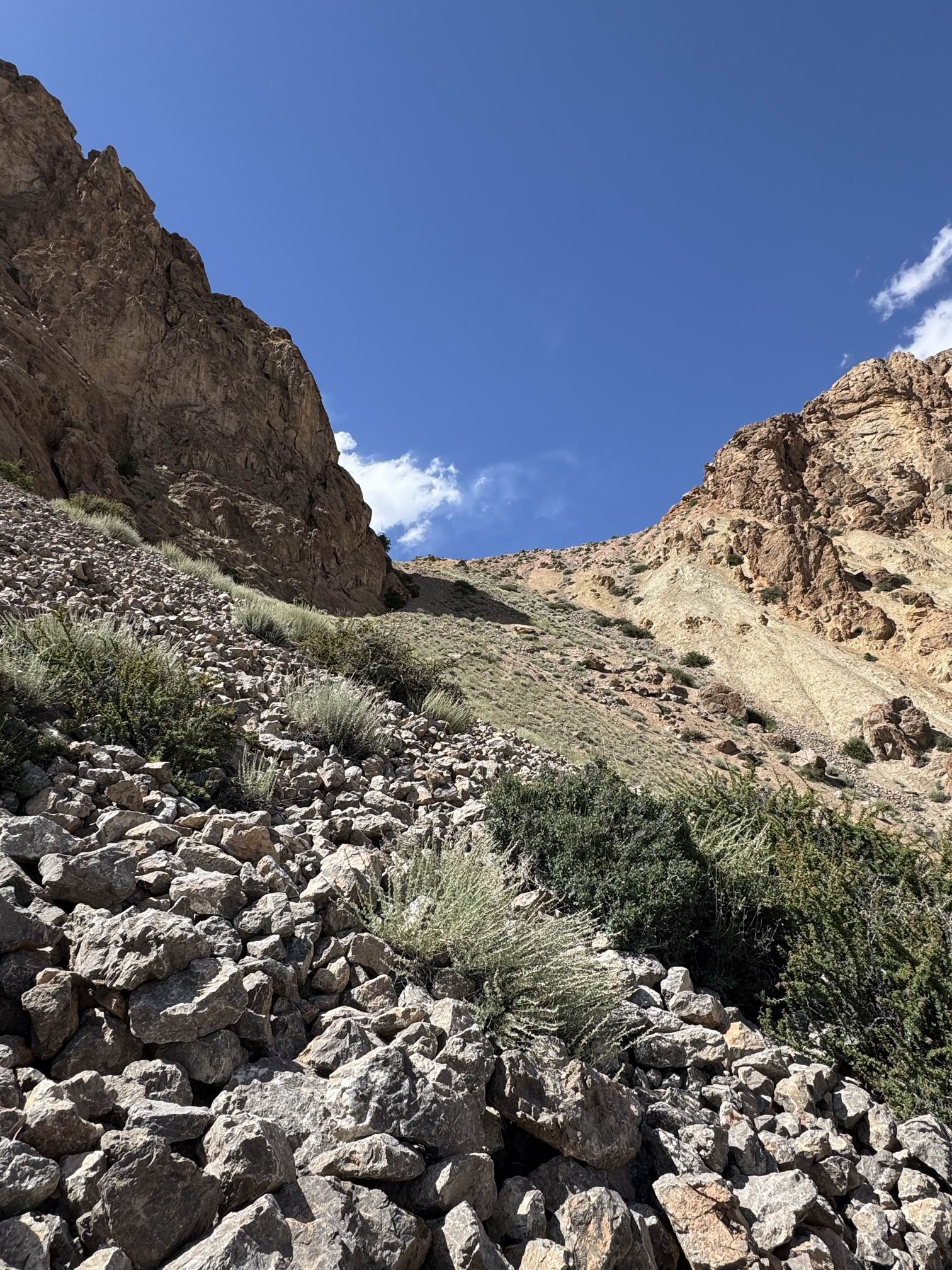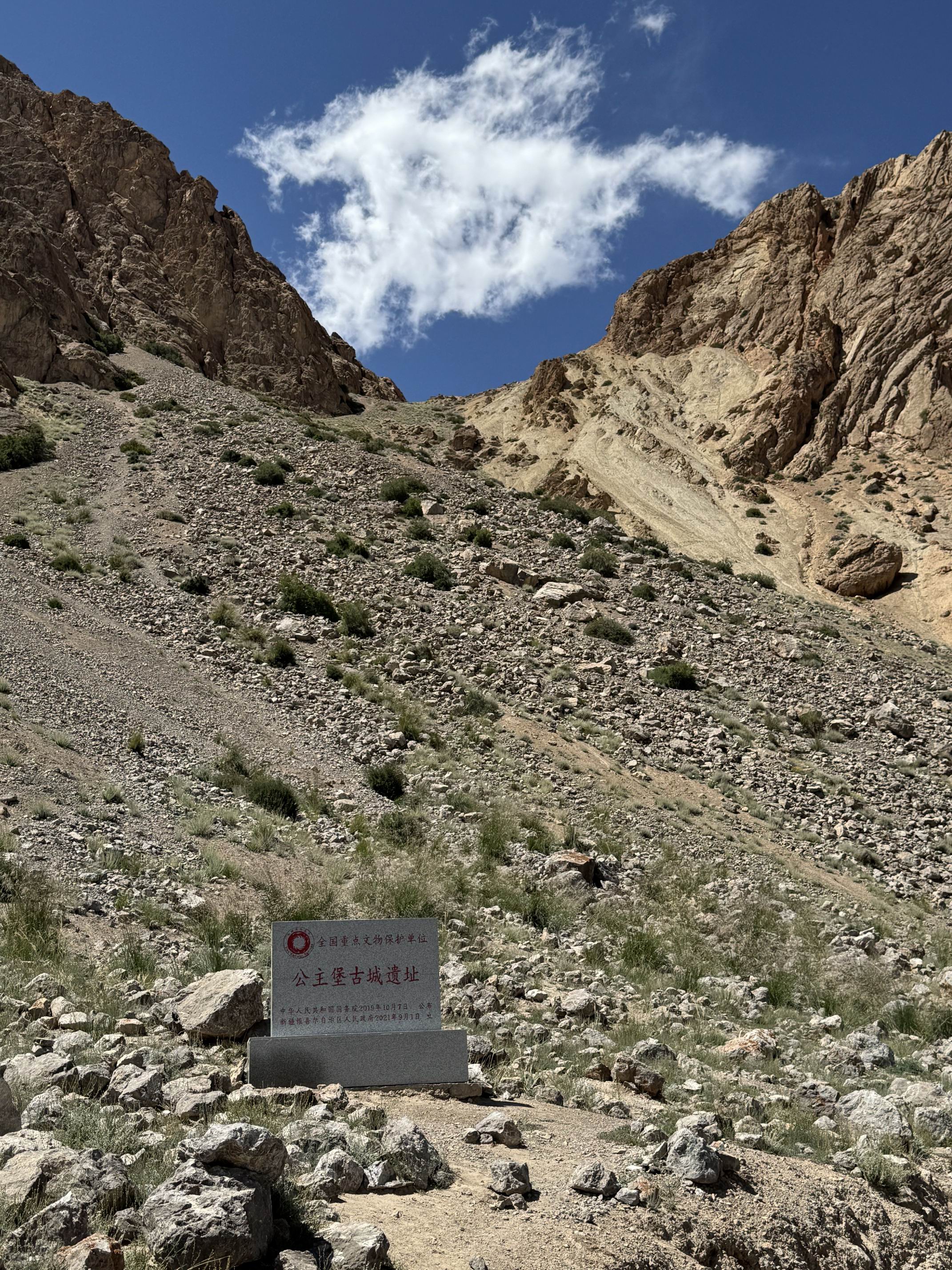 导航去公主堡. 现在新修了桥, 回程很容易可顺路去公主堡, 以前要先开到达布达尔乡从那边过桥到对岸再开回来. ~16:15来到公主堡, 从远处就可以看到右边的小悬崖, 左边的公主堡(山顶浅色土墙边缘), 塔什库尔干河从中间流过, 卡拉其古河和塔敦巴什河在这里交汇, 非常熟悉的感觉. 2012年8月3日,我和lovezz第一次来公主堡,那时路况不好,我们停下小奥拓,徒步到塔什库尔干河东侧的一处小悬崖,看到了卡拉其古峡谷的小路,我们知道公主堡在对面,但找了半天也没认出,最近才发现照片已经拍到了公主堡。当时非常想去对岸寻找,但只有先去达布达尔乡过桥,我们时间不够就放弃了。这是13年前的游记: http://hp612.cn/archives/1966.html. 今天是2025年8月3日,整整13年后,我终于爬了公主堡,完成了一件想做的事情, 我觉得公主堡名字很好听, 来源于大唐西域记的一个传说. 直接开爬, ~16:26开始, ~18:48下来. 盛老板和珍珠爬了2步不爬了, 但盛老板儿子争气, 和我一起爬了上去. 一开始大的乱石堆比较好爬, 然后是陡峭的小碎石堆不稳定站不且周围有带刺的植物, 然后是陡峭又比较滑的土坡, 每一步都要脚踏实地. 本来只想爬一半, 但最后逐渐接近登顶了, 只是最后一点感觉要攀岩, 时间不多膝盖也不行也实在危险, 就放弃了, 但是已经近距离看到公主堡最高的那个土墙(戍堡), 满意. 下山比较狼狈, 碎石流沙容易滑, 摔倒了好几次, 手也破了. 这次攀爬对盛老板儿子应该也是一次难忘的经历. 整个爬山的过程我还发了小红书. 下来之后, 来到卡拉其古山谷, 往里面走了一点, 这里通向塔吉克斯坦, 隔壁的瓦罕走廊通向阿富汗.