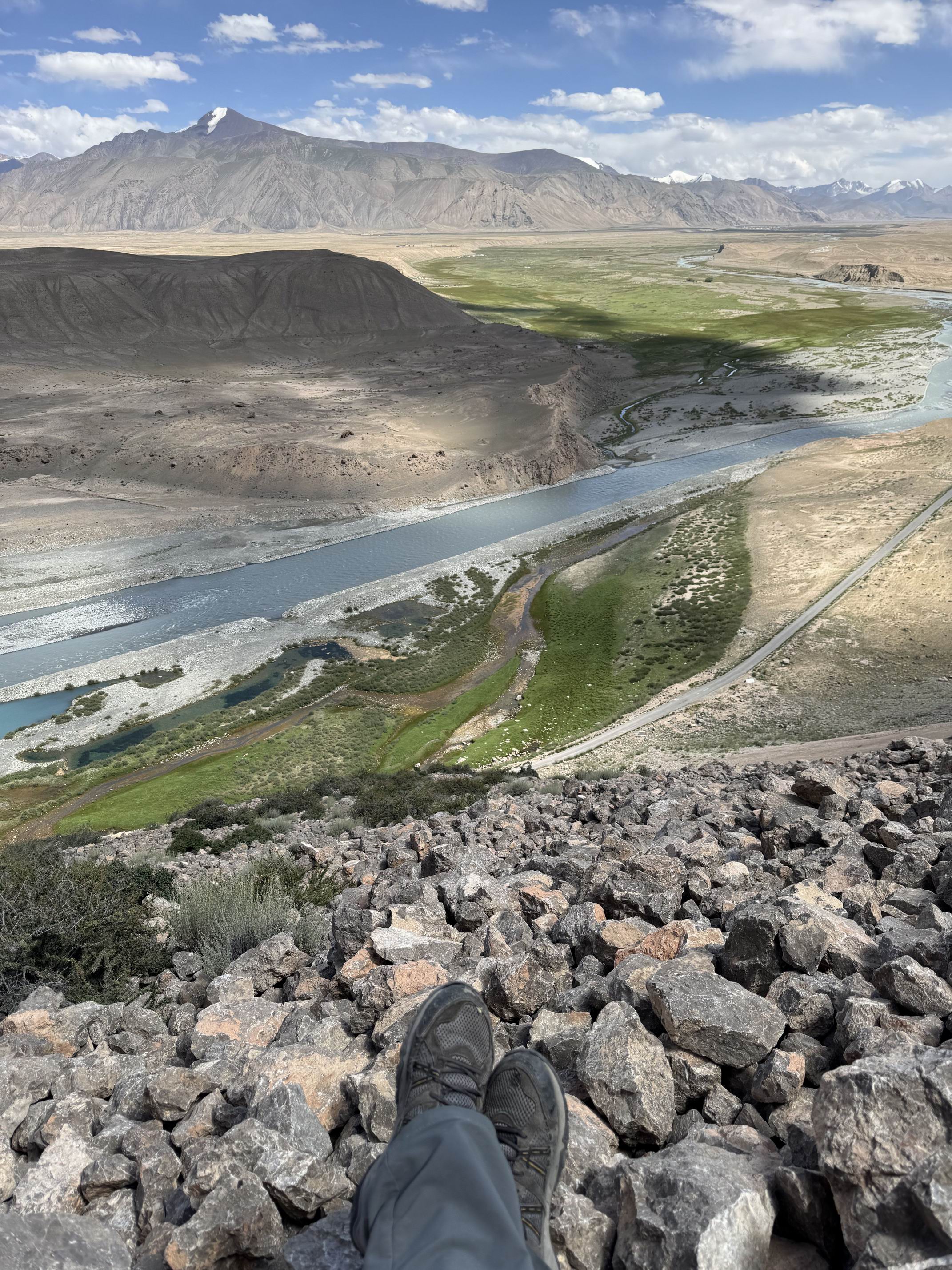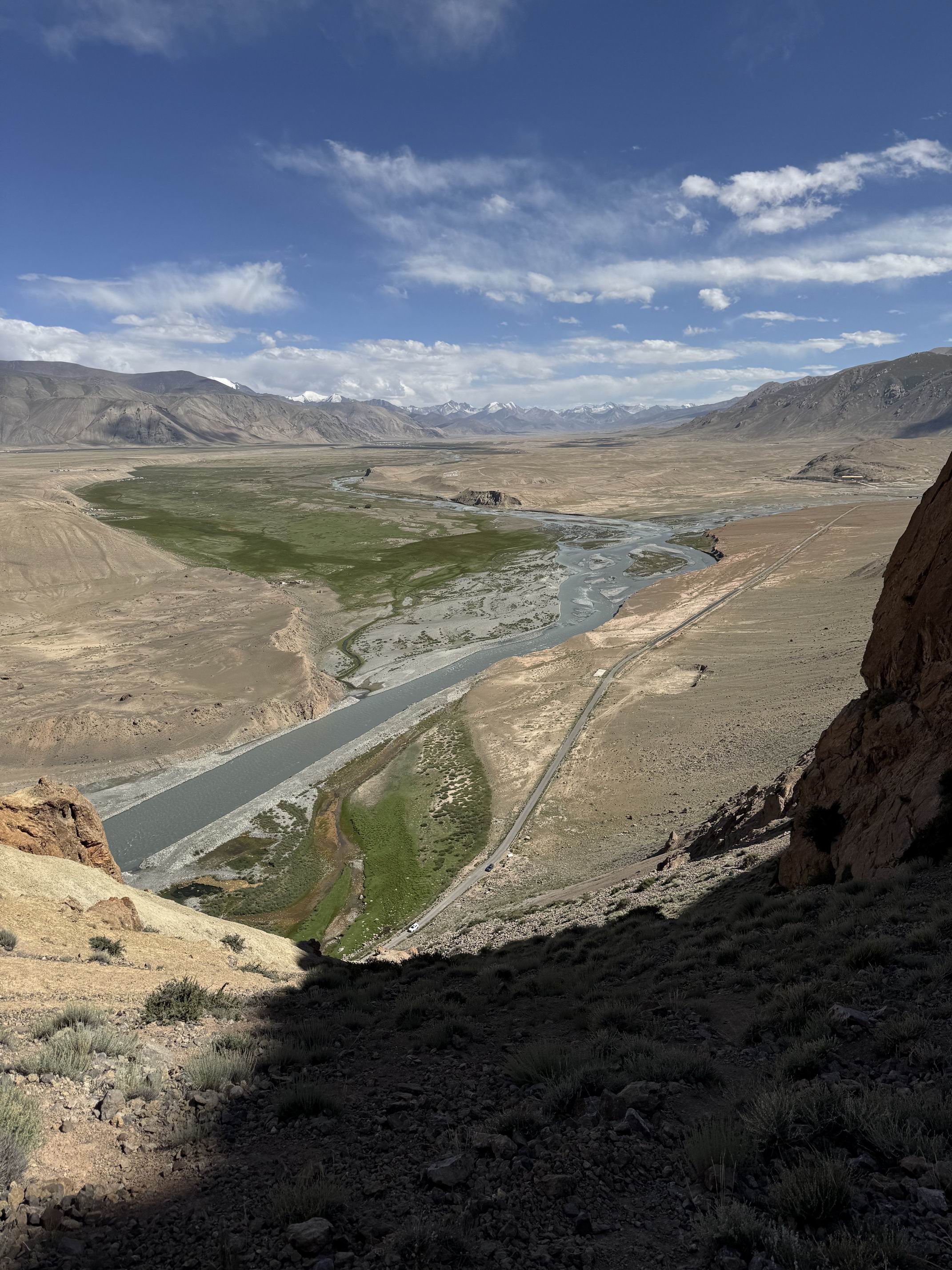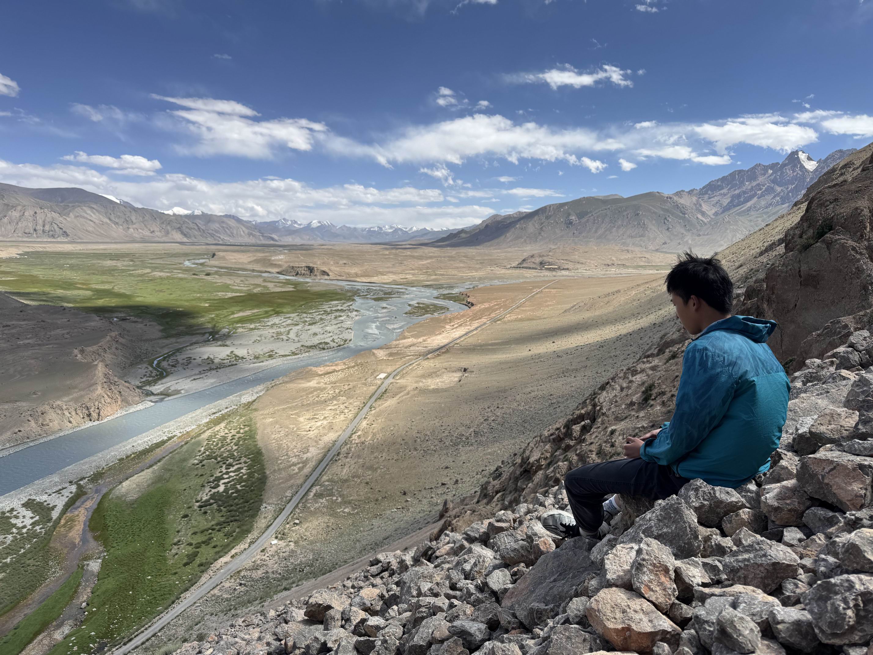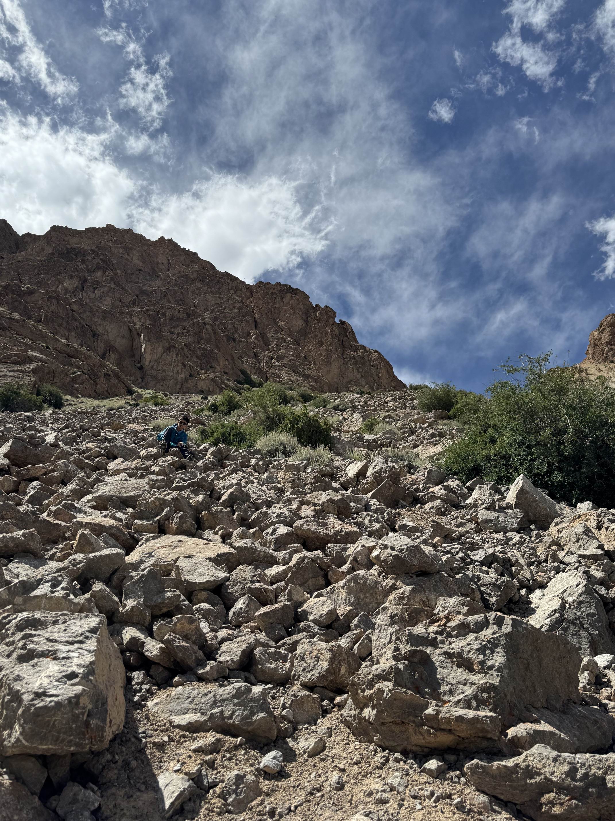 导航去公主堡. 现在新修了桥, 回程很容易可顺路去公主堡, 以前要先开到达布达尔乡从那边过桥到对岸再开回来. ~16:15来到公主堡, 从远处就可以看到右边的小悬崖, 左边的公主堡(山顶浅色土墙边缘), 塔什库尔干河从中间流过, 卡拉其古河和塔敦巴什河在这里交汇, 非常熟悉的感觉. 2012年8月3日,我和lovezz第一次来公主堡,那时路况不好,我们停下小奥拓,徒步到塔什库尔干河东侧的一处小悬崖,看到了卡拉其古峡谷的小路,我们知道公主堡在对面,但找了半天也没认出,最近才发现照片已经拍到了公主堡。当时非常想去对岸寻找,但只有先去达布达尔乡过桥,我们时间不够就放弃了。这是13年前的游记: http://hp612.cn/archives/1966.html. 今天是2025年8月3日,整整13年后,我终于爬了公主堡,完成了一件想做的事情, 我觉得公主堡名字很好听, 来源于大唐西域记的一个传说. 直接开爬, ~16:26开始, ~18:48下来. 盛老板和珍珠爬了2步不爬了, 但盛老板儿子争气, 和我一起爬了上去. 一开始大的乱石堆比较好爬, 然后是陡峭的小碎石堆不稳定站不且周围有带刺的植物, 然后是陡峭又比较滑的土坡, 每一步都要脚踏实地. 本来只想爬一半, 但最后逐渐接近登顶了, 只是最后一点感觉要攀岩, 时间不多膝盖也不行也实在危险, 就放弃了, 但是已经近距离看到公主堡最高的那个土墙(戍堡), 满意. 下山比较狼狈, 碎石流沙容易滑, 摔倒了好几次, 手也破了. 这次攀爬对盛老板儿子应该也是一次难忘的经历. 整个爬山的过程我还发了小红书. 下来之后, 来到卡拉其古山谷, 往里面走了一点, 这里通向塔吉克斯坦, 隔壁的瓦罕走廊通向阿富汗.
