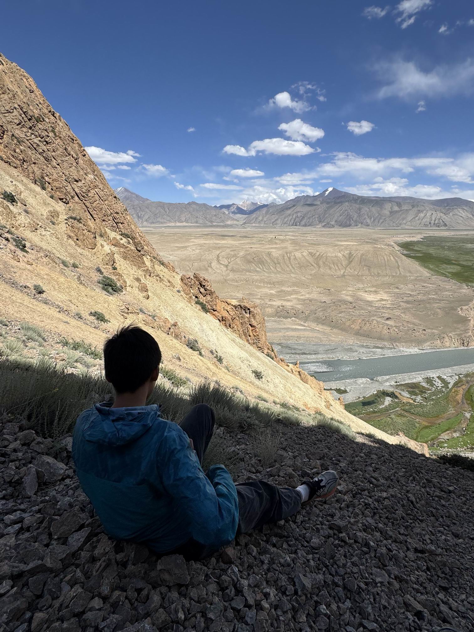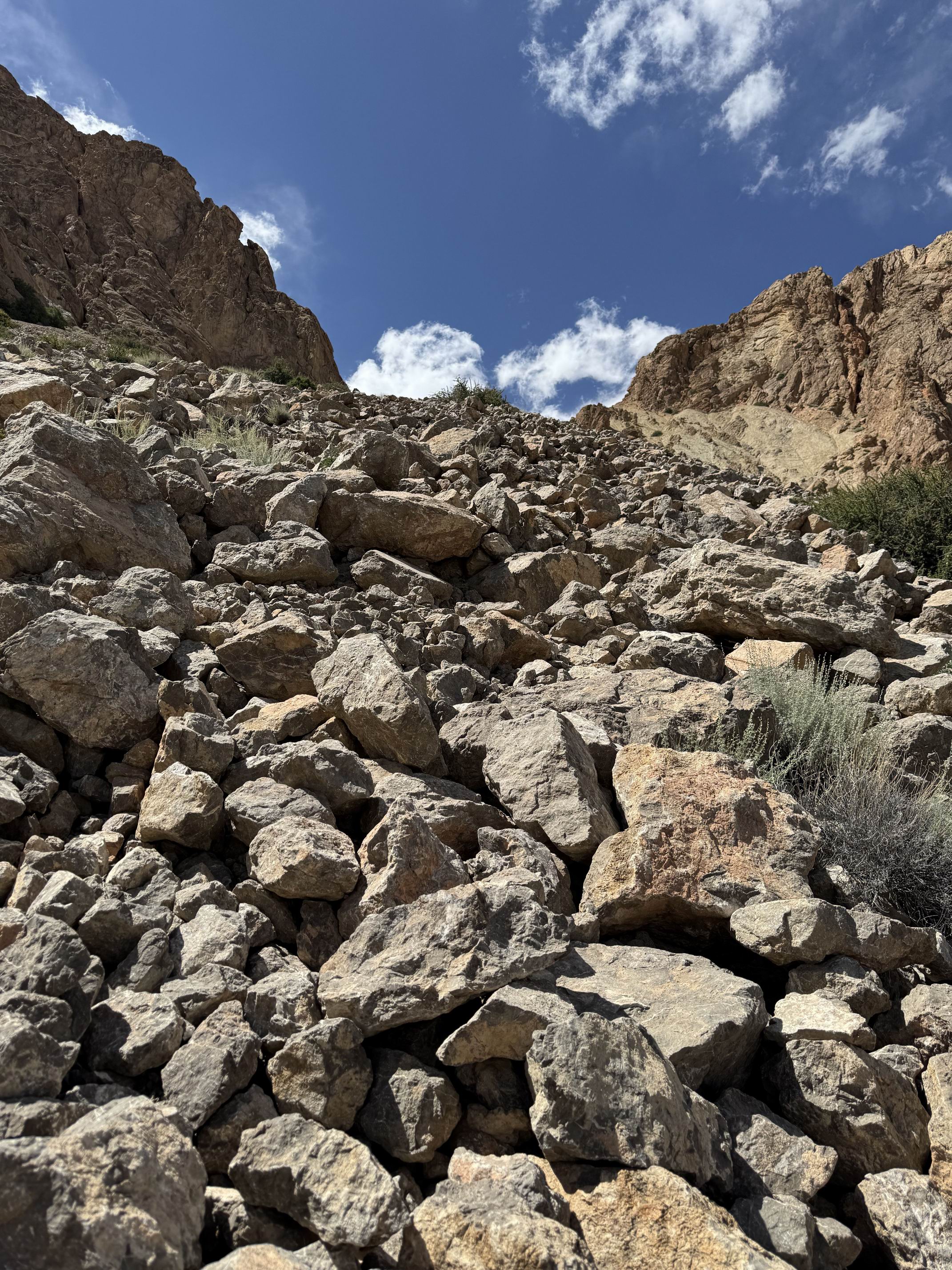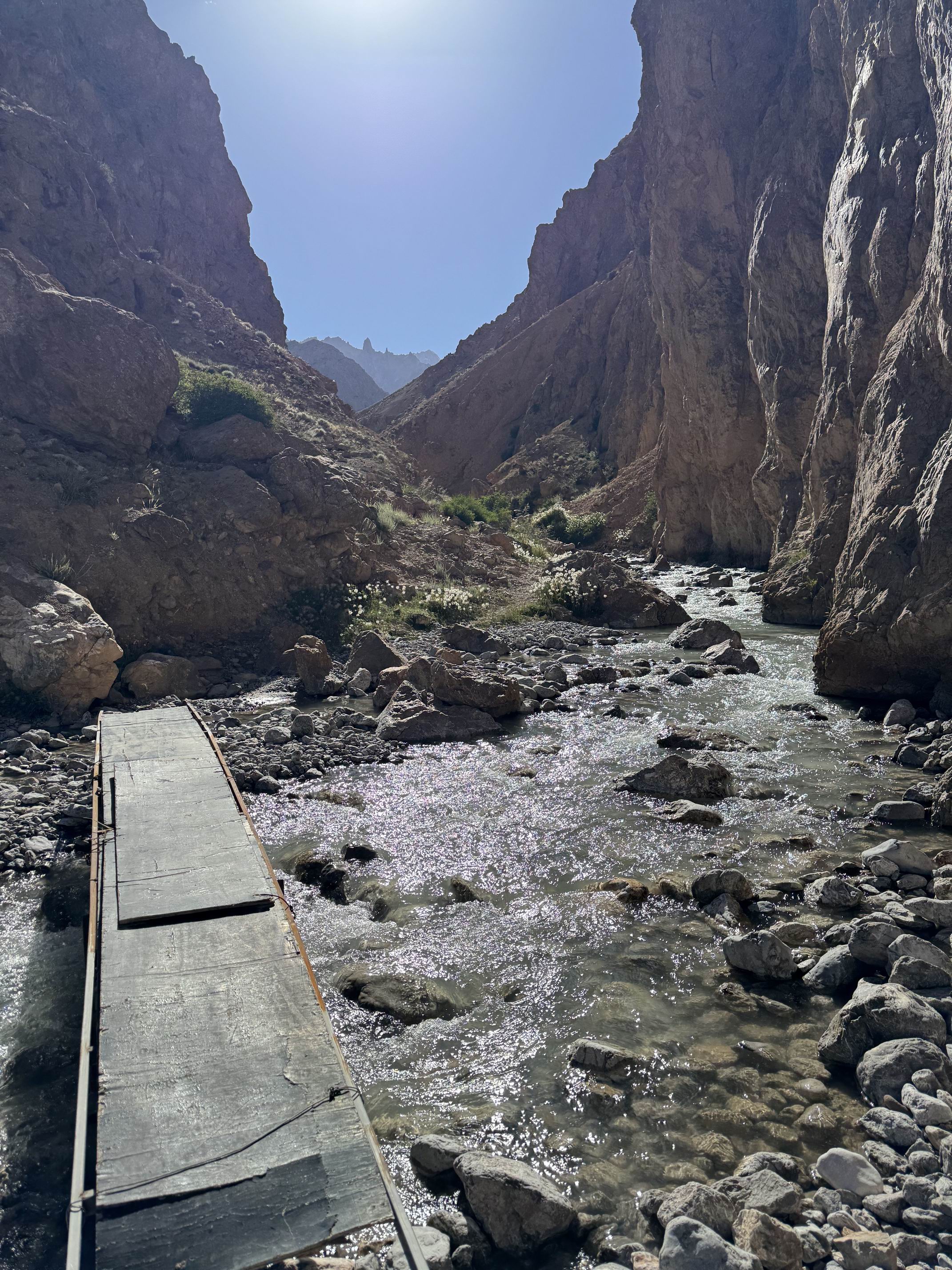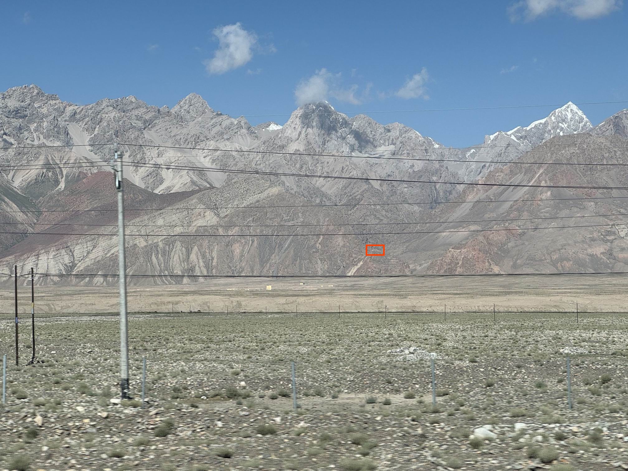 导航去公主堡. 现在新修了桥, 回程很容易可顺路去公主堡, 以前要先开到达布达尔乡从那边过桥到对岸再开回来. ~16:15来到公主堡, 从远处就可以看到右边的小悬崖, 左边的公主堡(山顶浅色土墙边缘), 塔什库尔干河从中间流过, 卡拉其古河和塔敦巴什河在这里交汇, 非常熟悉的感觉. 2012年8月3日,我和lovezz第一次来公主堡,那时路况不好,我们停下小奥拓,徒步到塔什库尔干河东侧的一处小悬崖,看到了卡拉其古峡谷的小路,我们知道公主堡在对面,但找了半天也没认出,最近才发现照片已经拍到了公主堡。当时非常想去对岸寻找,但只有先去达布达尔乡过桥,我们时间不够就放弃了。这是13年前的游记: http://hp612.cn/archives/1966.html. 今天是2025年8月3日,整整13年后,我终于爬了公主堡,完成了一件想做的事情, 我觉得公主堡名字很好听, 来源于大唐西域记的一个传说. 直接开爬, ~16:26开始, ~18:48下来. 盛老板和珍珠爬了2步不爬了, 但盛老板儿子争气, 和我一起爬了上去. 一开始大的乱石堆比较好爬, 然后是陡峭的小碎石堆不稳定站不且周围有带刺的植物, 然后是陡峭又比较滑的土坡, 每一步都要脚踏实地. 本来只想爬一半, 但最后逐渐接近登顶了, 只是最后一点感觉要攀岩, 时间不多膝盖也不行也实在危险, 就放弃了, 但是已经近距离看到公主堡最高的那个土墙(戍堡), 满意. 下山比较狼狈, 碎石流沙容易滑, 摔倒了好几次, 手也破了. 这次攀爬对盛老板儿子应该也是一次难忘的经历. 整个爬山的过程我还发了小红书. 下来之后, 来到卡拉其古山谷, 往里面走了一点, 这里通向塔吉克斯坦, 隔壁的瓦罕走廊通向阿富汗.