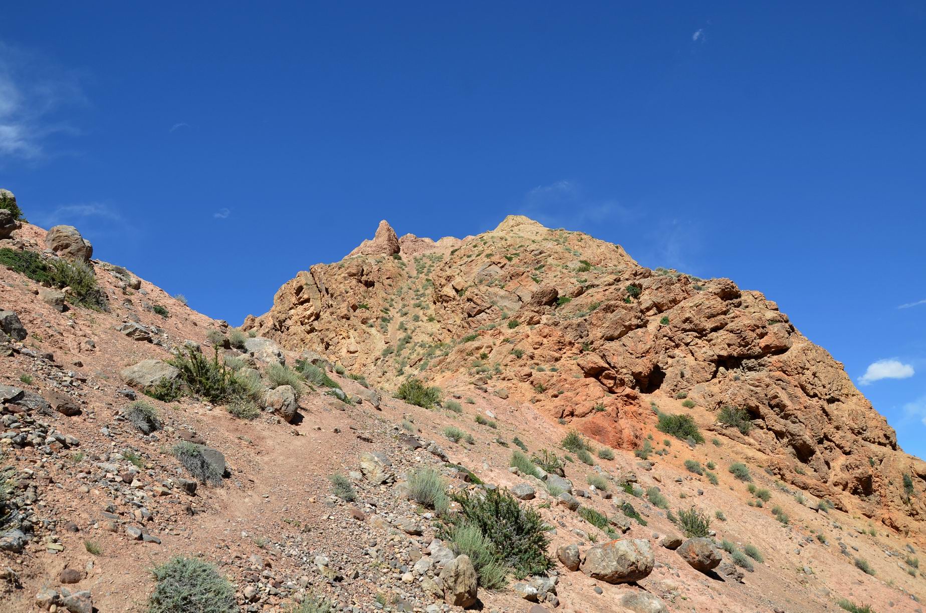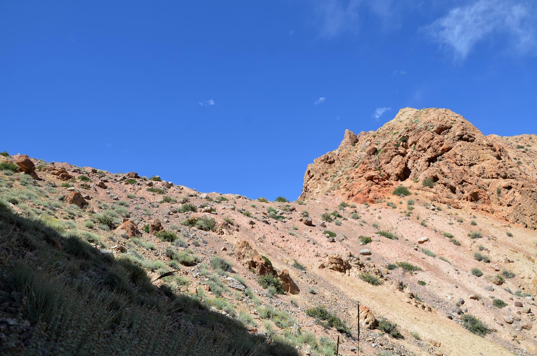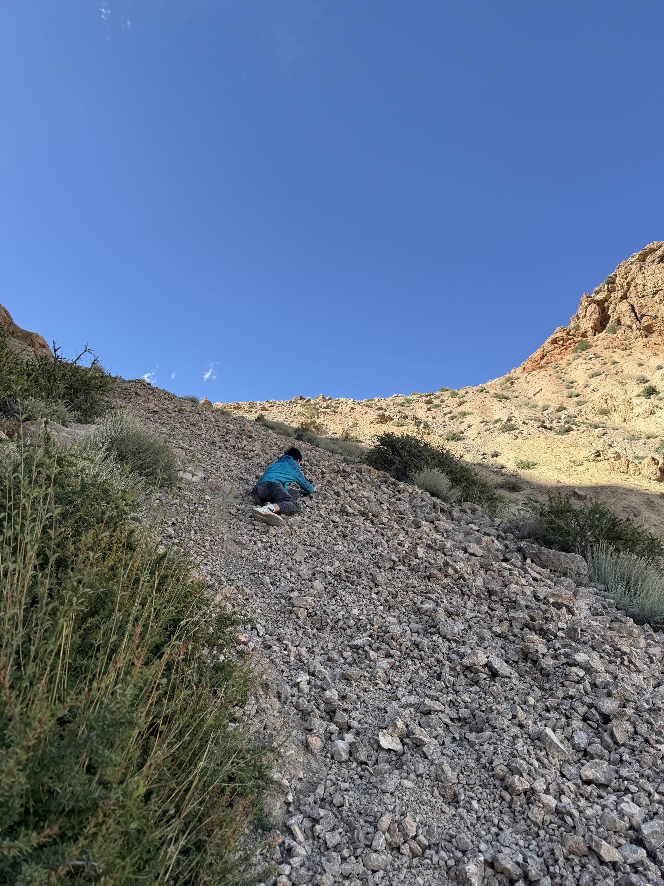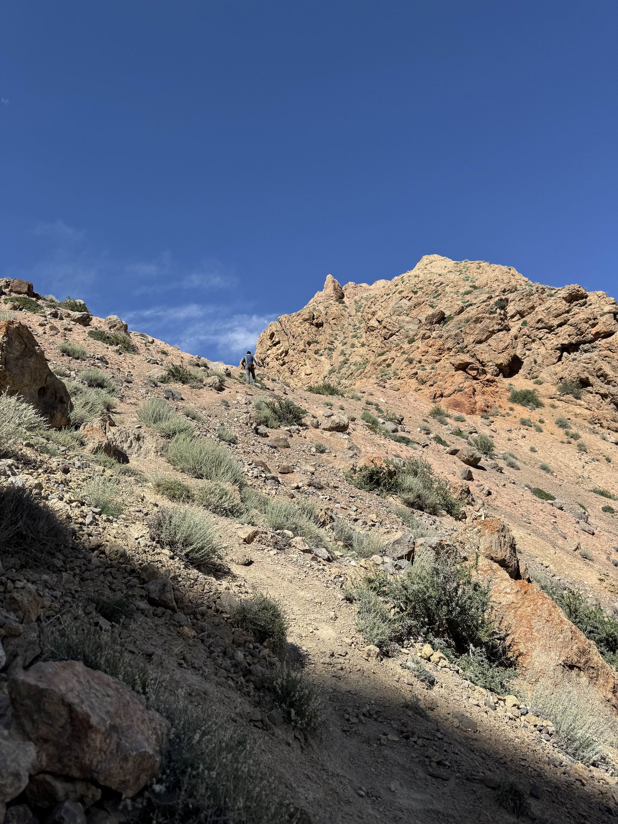 导航去公主堡. 现在新修了桥, 回程很容易可顺路去公主堡, 以前要先开到达布达尔乡从那边过桥到对岸再开回来. ~16:15来到公主堡, 从远处就可以看到右边的小悬崖, 左边的公主堡(山顶浅色土墙边缘), 塔什库尔干河从中间流过, 卡拉其古河和塔敦巴什河在这里交汇, 非常熟悉的感觉. 2012年8月3日,我和lovezz第一次来公主堡,那时路况不好,我们停下小奥拓,徒步到塔什库尔干河东侧的一处小悬崖,看到了卡拉其古峡谷的小路,我们知道公主堡在对面,但找了半天也没认出,最近才发现照片已经拍到了公主堡。当时非常想去对岸寻找,但只有先去达布达尔乡过桥,我们时间不够就放弃了。这是13年前的游记: http://hp612.cn/archives/1966.html. 今天是2025年8月3日,整整13年后,我终于爬了公主堡,完成了一件想做的事情, 我觉得公主堡名字很好听, 来源于大唐西域记的一个传说. 直接开爬, ~16:26开始, ~18:48下来. 盛老板和珍珠爬了2步不爬了, 但盛老板儿子争气, 和我一起爬了上去. 一开始大的乱石堆比较好爬, 然后是陡峭的小碎石堆不稳定站不且周围有带刺的植物, 然后是陡峭又比较滑的土坡, 每一步都要脚踏实地. 本来只想爬一半, 但最后逐渐接近登顶了, 只是最后一点感觉要攀岩, 时间不多膝盖也不行也实在危险, 就放弃了, 但是已经近距离看到公主堡最高的那个土墙(戍堡), 满意. 下山比较狼狈, 碎石流沙容易滑, 摔倒了好几次, 手也破了. 这次攀爬对盛老板儿子应该也是一次难忘的经历. 整个爬山的过程我还发了小红书. 下来之后, 来到卡拉其古山谷, 往里面走了一点, 这里通向塔吉克斯坦, 隔壁的瓦罕走廊通向阿富汗.